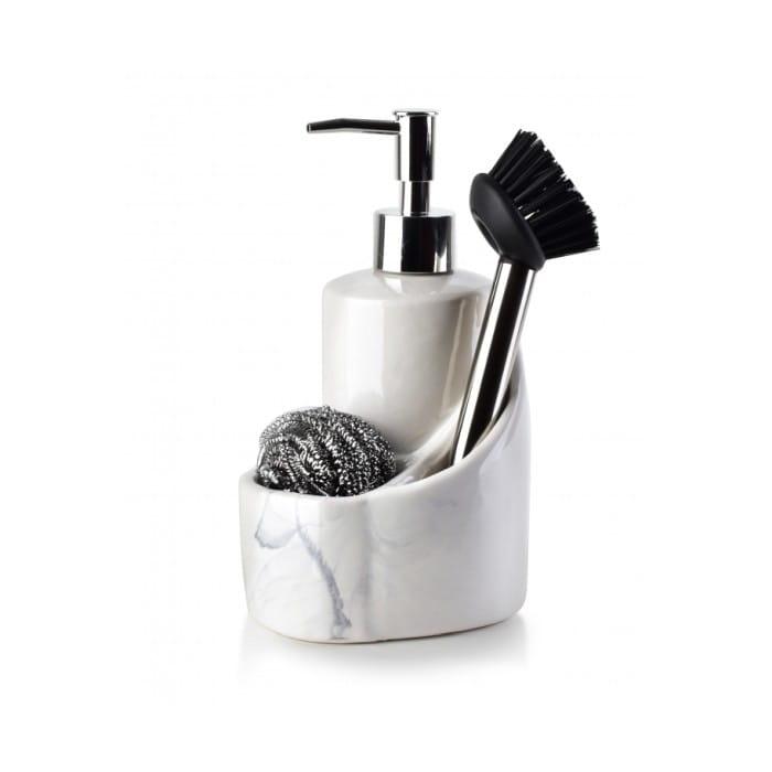 Oryginalny dozownik z serii Odette na płyn do naczyń idealnie nada się do każdej kuchni, jak i łazienki. W zestawie znajduje się również gąbka oraz szczoteczka. Taki zestaw pozwoli zachować porządek przy zlewie, a także pozwoli przechowywać wszystkie akcesoria w zasięgu ręki. Nowoczesna forma i biała kolorystyka dozownika z szarymi elementami idealnie dopasuje się do każdego stylu kuchni. Wykonany z wysokiej jakości ceramiki, łatwy w oczyszczaniu i przenoszeniu, odporne na zarysowania.