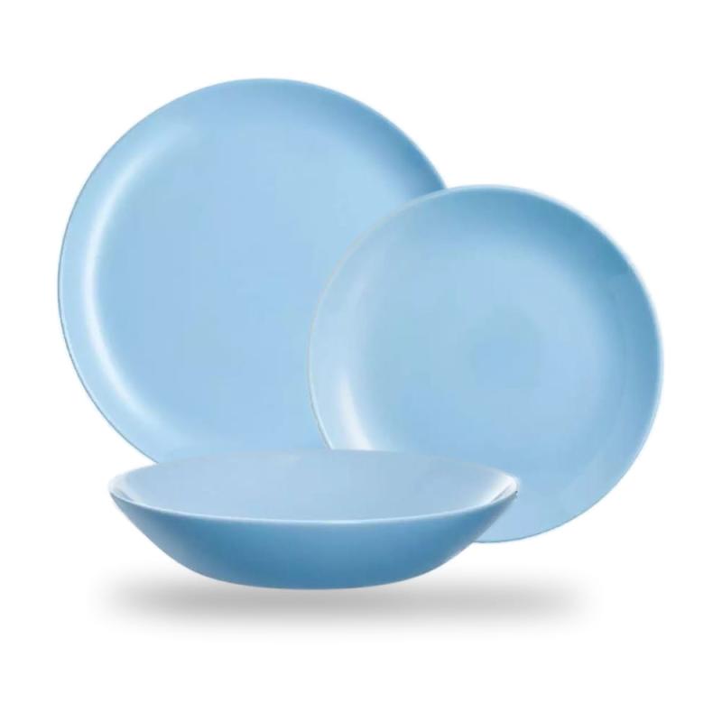 Talerze w kolorze niebieskim. Serwis obiadowy na 6 osób Diwali Light Blue 18-el. stworzony jest z elementów tzw. bez brzegowych to oznacza, iż posiadamy na talerzu większą ilość miejsca na nasze danie. Talerze głębokie w kształcie calotte czyli miseczek salaterek.