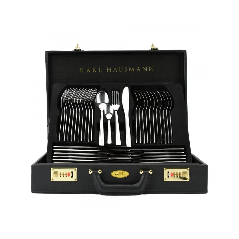 Luksusowe sztućce w pięknej walizce Monica to 72- elementowy komplet sztućców marki Karl Hausmann, który doskonale dopełni wystrój każdego stołu, podkreślając jego wyjątkowy charakter w codziennym użytkowaniu. Charakteryzują się klasycznym lekko kwadratowym kształtem z delikatnym zdobieniem biegnącym wzdłuż rączki, wysoką jakością i precyzją wykonania. Oferowane sztućce są trwałe, masywne, nie wyginają się, nie niszczą się, ani nie rdzewieją. Zachowują wysoki połysk pomimo wielu lat używania oraz nie są narażone na uszkodzenia. Komplet zawiera: 12 noży stołowych, 12 łyżek stołowych, 12 widelców stołowych, 12 łyżeczek do herbaty, 12 widelczyków do ciasta, 2 widelce do mięsa, 2 łyżki do serwowania, widelec do sałatek, łyżeczkę do cukru, łyżeczkę do śmietanki, łyżkę do sałatek, łyżkę wazową, łyżkę do sosów, łopatkę do ciasta oraz szczypce do cukru. Sztućce zapakowane w elegancką walizkę wykonaną z dbałością o najmniejszy szczegół. Wykonane z wysokiej jakości stali szlachetnej chromowo-niklowej 18/10, która oferuje wysoce dopracowane wykończenie, aby nadać im wyjątkowy charakter. Produkt jest odporny na zarysowania oraz wysoką temperaturę, nie wchodzą w reakcję ze spożywanymi potrawami. Można myć w zmywarce, jednak aby jak najdłużej cieszyły się swoją niezawodnością i pięknym wyglądem, zalecamy myć je ręcznie.