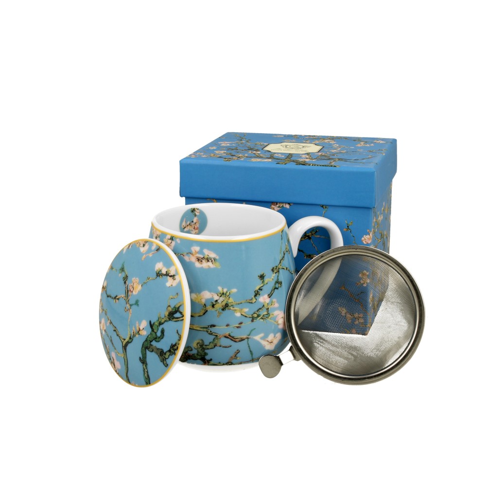 Elegancki kubek baryłka z zaparzaczem z kolekcji Almond Blossom by Vincent van Gogh wchodzący w skład serii Art Gallery to niezwykle piękna porcelana. Wykonany w naturalnym kolorze z delikatnym połyskiem, który nada charakteru i funkcjonalności w codziennym użytkowaniu. Produkt zawiera zaparzacz do parzenia herbaty, ziół oraz pokrywkę, która w trakcie parzenia pozwala zaparzyć gorący napój z liści, a po wyjęciu sita posłuży jako podstawka pod zaparzacz. Charakteryzuje się nowoczesnym zdobieniem przedstawiający dzieło reprodukcji obrazu van Gogh'a "Kwitnący Migdałowiec". Motyw na obrazie odzwierciedla również fascynację Van Gogha sztuką japońską. Wykonany z wysokiej jakości porcelany New Bone China z idealnie dopracowanym wykończeniem, natomiast sito ze stali nierdzewnej. Łatwy w utrzymaniu czystości, odporny na zarysowania. Produkt zapakowany w ozdobne pudełko dekorowane tym samym motywem. Jest to doskonały pomysł na niebanalny prezent dla każdego. Można używać w kuchence mikrofalowej oraz myć w zmywarce.
