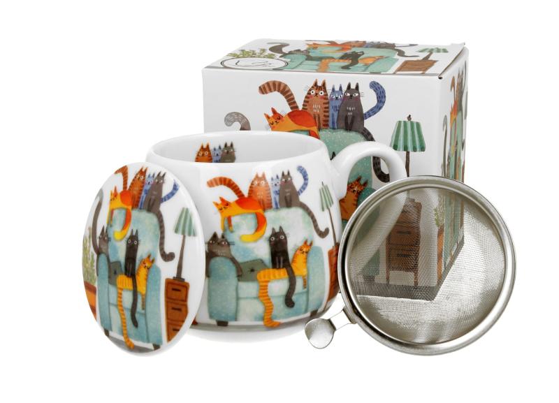 Kubek baryłka 430 ml z zaparzaczem i pokrywką Koci Świat KOTY NA FOTELU wchodzący w skład serii Animals, wykonany z porcelany New Bone China, charakteryzującej się elegancką i naturalną kremowo - białą barwą z delikatnym połyskiem, a także wyjątkową wytrzymałością.