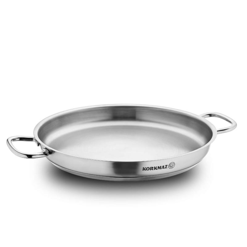 Patelnia gastronomiczna z uchwytami renomowanej tureckiej marki Korkmaz. Produkty z serii Pro Line wykonane są z wysokogatunkowej stali nierdzewnej 18/10. Patelnia wyposażona w grube dno, doskonale rozprowadzające ciepło po całej powierzchnii. Produkt przeznaczony do wszystkich typów kuchenek. Można zmywać w zmywarce.