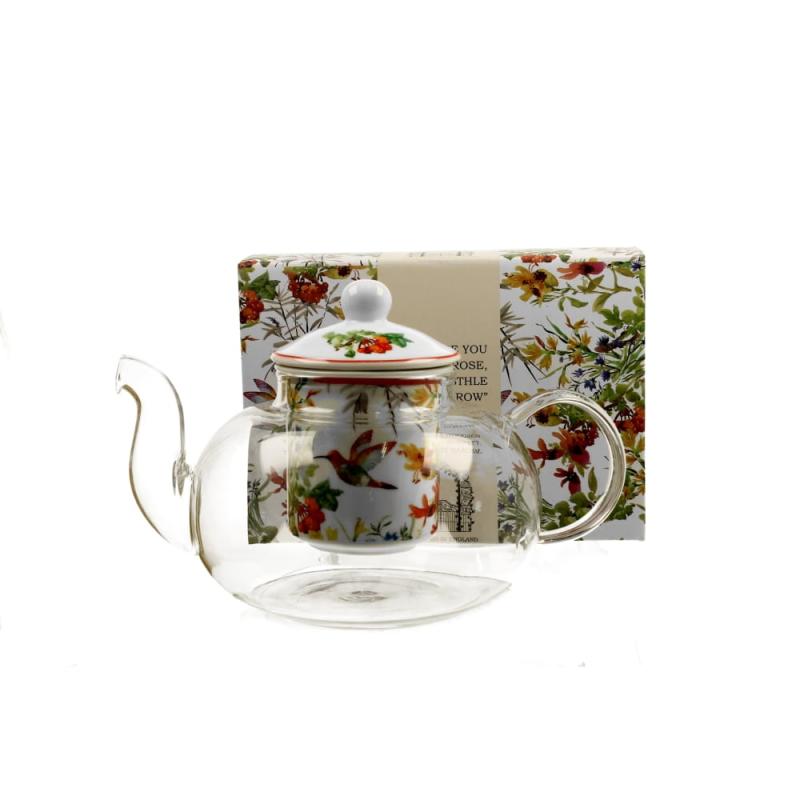 Szklany dzbanek z porcelanowym zaparzaczem Linnea wchodzący w skład serii Secret Garden to niezwykle piękna porcelana w eleganckim wydaniu. Dzbanuszek wykonany ze szkła hartowanego natomiast filtr i pokrywa wykonane z porcelany w naturalnym kolorze z delikatnym połyskiem, który nada charakteru i funkcjonalności w codziennym użytkowaniu. Charakteryzuje się nowoczesnym zdobieniem przedstawiający motyw malowanych kwiatów w wyrazistych kolorach oraz uroczego kolibra. Wykonany z wysokiej jakości szkła hartowanego oraz porcelany z idealnie dopracowanym wykończeniem. Łatwy w utrzymaniu czystości, odporny na zarysowania. Produkt zapakowany w ozdobne pudełko dekorowane tym samym motywem. Delikatne barwy w modnej kompozycji zdecydowanie wyróżnia kolekcję Linnea. Jest to doskonały pomysł na niebanalny prezent dla każdego. Można używać w kuchence mikrofalowej oraz myć w zmywarce.