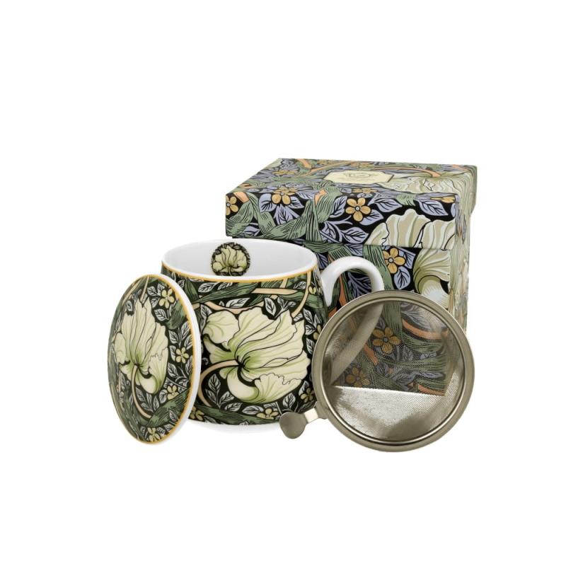 Elegancki kubek z zaparzaczem z kolekcji Pimpernel by William Morris wchodzący w skład serii Art Gallery to niezwykle piękna porcelana. Wykonany w naturalnym kolorze z delikatnym połyskiem, który nada charakteru i funkcjonalności w codziennym użytkowaniu. Produkt zawiera zaparzacz do parzenia herbaty, ziół oraz pokrywkę, która w trakcie parzenia pozwala zaparzyć gorący napój z liści, a po wyjęciu sita posłuży jako podstawka pod zaparzacz. Charakteryzuje się nowoczesnym zdobionym ornamentem z wirujących liści i kwiatów gałązek oraz dużego polnego kwiatu na ciemnozielonym tle, wykończone złotą obwódką. Wyrazisty kolor tła nada kolekcji niebanalnego charakteru, szyku i elegancji. Wykonany z wysokiej jakości porcelany New Bone China z idealnie dopracowanym wykończeniem, natomiast sito ze stali nierdzewnej. Łatwy w utrzymaniu czystości, odporny na zarysowania. Produkt zapakowany w ozdobne pudełko dekorowane tym samym motywem. Jest to doskonały pomysł na niebanalny prezent dla każdego. Można używać w kuchence mikrofalowej oraz myć w zmywarce.